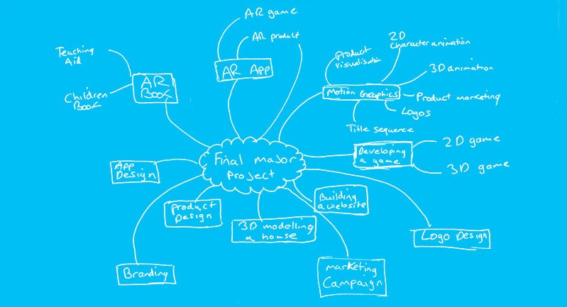I felt it was necessary to brainstorm different ideas for a potential final major project. I came up with projects that would give cater my skillset but also would provide a challenge, allowing me to learn other skills. The ideas ranged from website design to 3D modelling, giving an excellent range to select from. Although I had brainstormed ideas that did not feature 3D modelling, I felt it would not be beneficial for me to pursue a final major project which did not have modelling because it would not allow me to improve on my 3D skills before heading out to industry. Hence, the three ideas below containing elements of modelling.