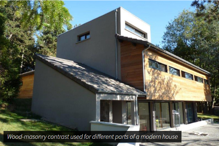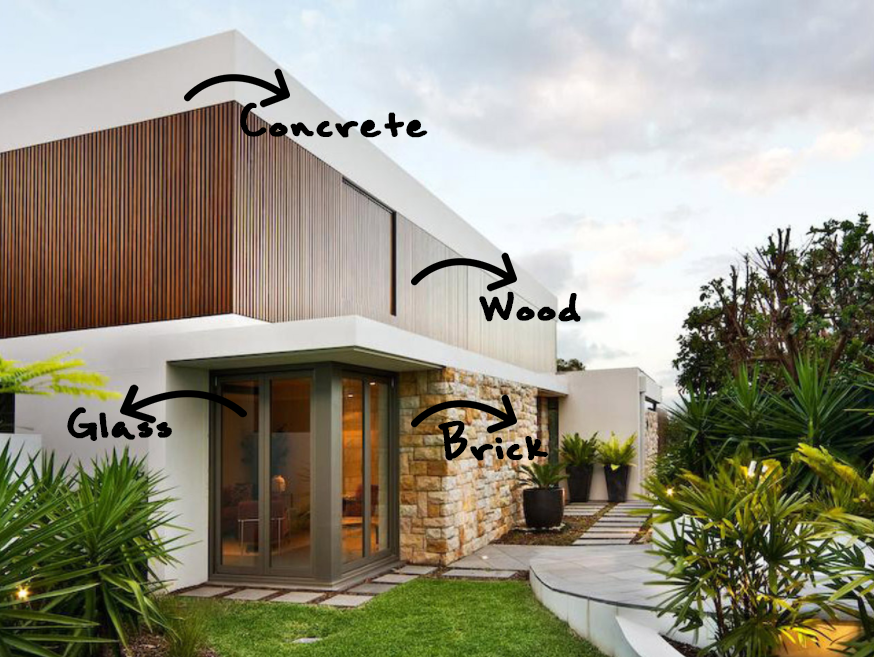 The materials used in modern homes are typically brick, stone (e.g. marble, granite, travertine, limestone), manufactured stone, concrete, glass, stucco, tile, wood and cladding. Each of these materials vary on impact they have on the environment, but often the materials are selected based upon their environmental impact and the sustainability of said materials.
