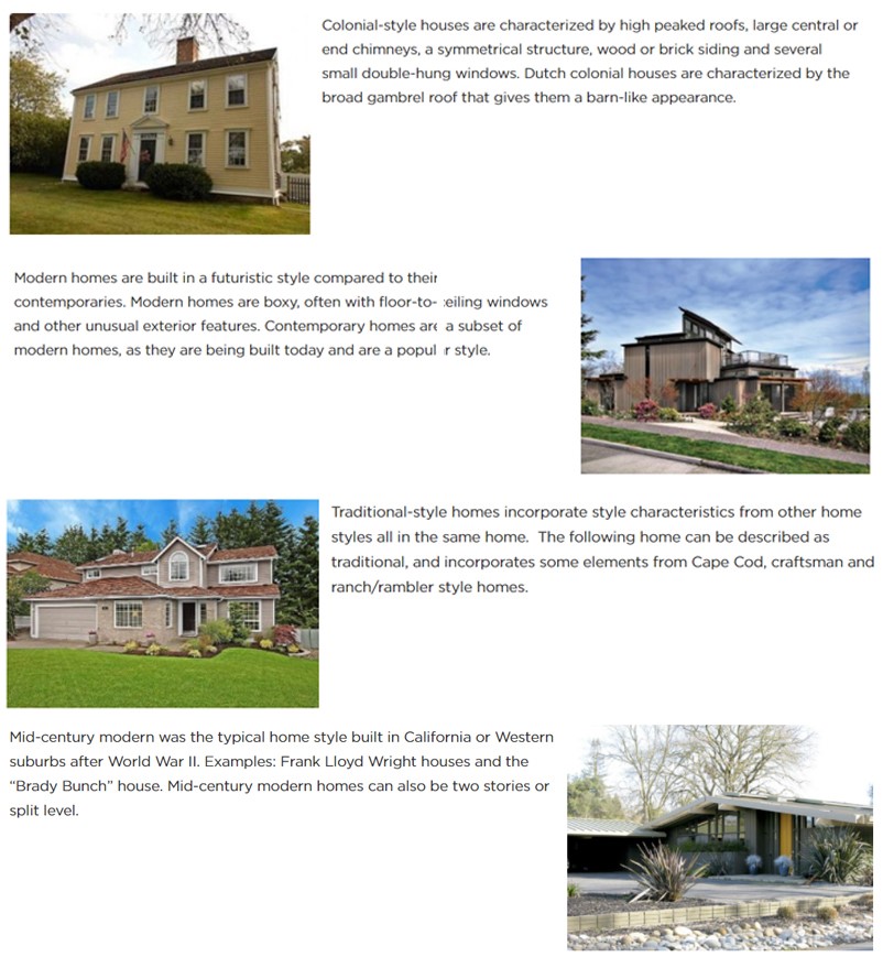 Before delving into designing potential houses for this project, I first needed to know the differences in houses to be able to select the style of the house. Zillow research provided information on different house styles and the key components which make up the style. I felt it was important to know the different styles of houses because it would allow me to correctly design the houses and not include elements which are known for a different house style.